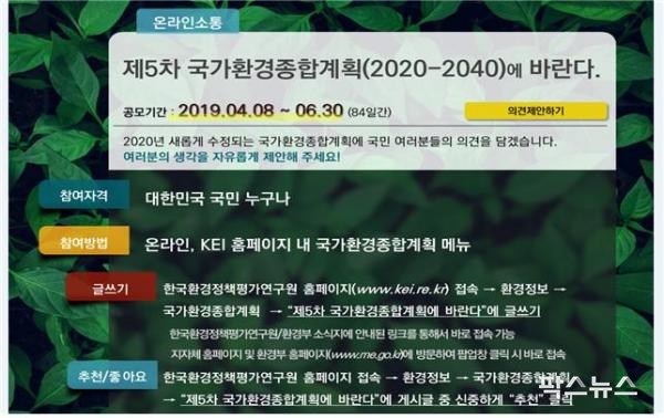 먼저 최대한 많은 국민 목소리를 담아내기 위해 한국환경정책평가연구원 누리집에 6월 30일까지 누구나 자유롭게 의견을 개진할 수 있는 온라인 소통방을 개설했다.