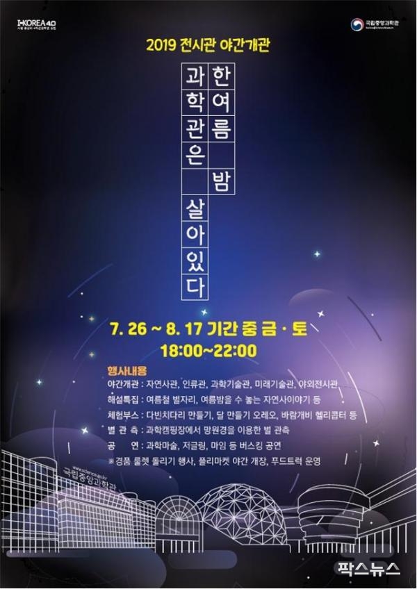 국립중앙과학관은 여름방학을 맞이하여 청소년과 국민들에게 야간 휴식의 장과 다양한 볼거리 및 체험프로그램을 제공하고자 ‘2019 한여름 밤 과학관은 살아있다’ 행사를 개최한다고 25일 밝혔다.
