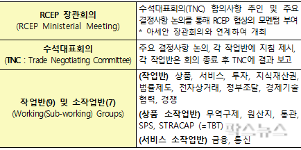 RCEP 협상구조 (자료 = 산업통상자원부 제공)유 본부장은 각국 장관들과 그간의 협상 진행상황을 점검하고, 시장접근 및 주요 규범 분야에서 연내 타결을 달성하기 위한 방안을 집중 논의할 계획이다.