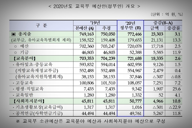 교육부가 2020년도 예산안을 77조 2,466억 원으로 편성했다. 2019년 본예산 74조 9,163억 원 대비 2조 3,303억 원 증가한 수치다.
