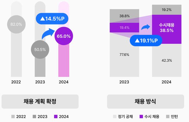 응답 결과 ‘채용 확정이다(‘확실히 있다’, ‘계획이 있으나 세부 조율 중이다’ 포함)’는 응답이 65.0%로 전년 대비 14.5%P 증가했다. 2022년 하반기 82.0%에 달했던 채용 확정 답변은 2023년 50.5%로 급락했다가 올해 들어 증가세로 돌아섰다.