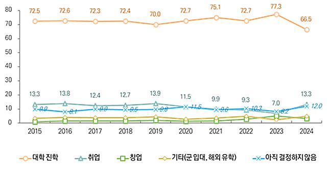 고등학생의 졸업 후 진로 계획에서는 대학 진학 희망 비율이 66.5%로 전년 대비 감소한 반면, 취업 희망 비율은 7.0%에서 13.3%로 대폭 증가했다. 이는 진로 선택의 다양화와 실질적인 취업 필요성 증가를 반영한 것으로 보인다;