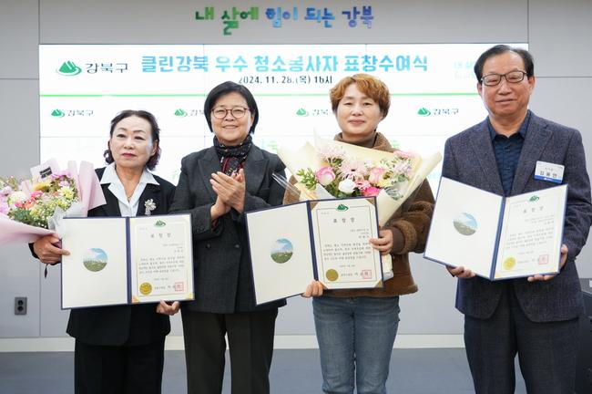 서울 강북구(구청장 이순희)는 지난달 28일 구청장실에서 `2024년 클린강북 우수 청소봉사자 표창 수여식`을 열고 지역 환경 개선에 기여한 봉사자들에게 감사와 격려의 뜻을 전했다고 밝혔다.