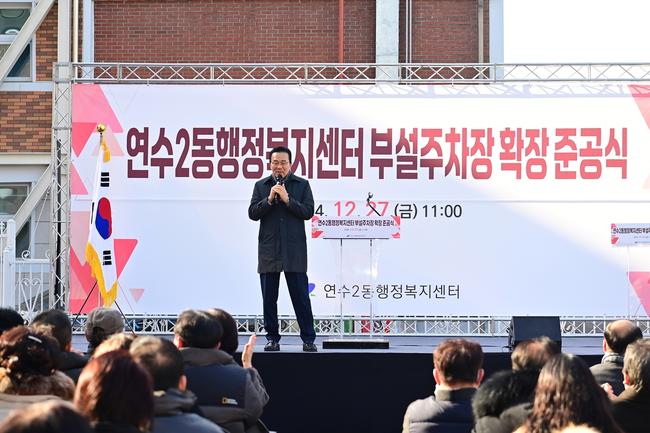 연수구(구청장 이재호)는 지난 27일 연수2동행정복지센터 부설주차장 확장공사를 마무리하고 준공식을 개최했다.