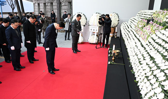 오세훈 서울시장이 지난 12월 31일(화), 서울시청 본관 정문 옆에 마련된 제주항공 여객기 사고 희생자 합동분향소에 방문해 조문하고 있다.