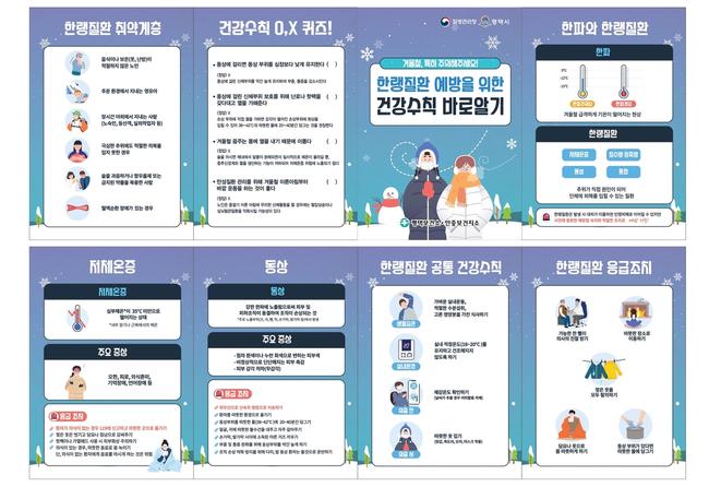 한파 대비 예방수칙으로는 ▲가벼운 실내 운동 ▲적절한 수분 섭취와 고른 식사로 건강 지키기 ▲실내 적정 보온상태(18∼20℃) 유지하기 ▲하루에 2∼3시간 간격으로 3번 최소한 10∼30분 환기하기 ▲외출 시 가벼운 옷으로 여러 벌 겹쳐 입기 ▲미끄럼 방지용 신발 신기 등이다.