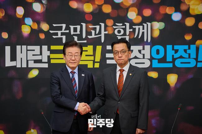 이재명 당대표가 2025.01.13.(월) 국회 본청 당대표회의실에서 최상목 대통령 권한대행 부총리 겸 기획재정부 장관을 접견하고 있다.