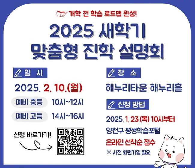 한편 구는 지난해 9월 개관한 `구립 양천교육지원센터`를 거점으로 맞춤형 설명회와 일대일 컨설팅 교육 등을 활발히 운영하고 있다. 특히 올해는 시기별 진학설명회와 권역별 소규모 특강을 연 25회로 확대하고 일대일 컨설팅은 2,800명 이상 지원해 더 많은 학부모와 학생들에게 꼭 필요한 학습·진학·진로 정보를 원스톱으로 제공할 계획이다.