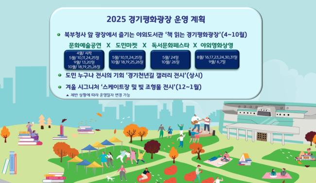 경기도가 밝힌 2025년 경기평화광장 운영계획에 따르면 도는 올해 문화예술공연, 도민마켓, 야외영화상영 등의 프로그램을 `책 읽는 경기평화광장` 사업으로 통합해 일상 속 휴식과 문화가 있는 광장 프로그램을 진행할 계획이다.