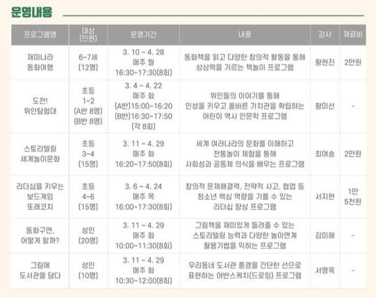 이번 상반기 독서진흥프로그램은 어린이 및 성인을 대상으로 6개 강좌로 구성됐으며, 3월 4일부터 4월 29일까지 진행될 예정이다.