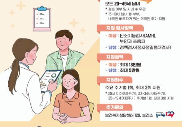 검진 항목은 여성의 경우 난소 기능 검사(AMH, 일명 `난소 나이 검사`) 및 부인과 초음파 검사로, 최대 13만 원까지 지원된다. 남성은 정자의 수, 모양, 운동성을 확인할 수 있는 정액검사를 받을 수 있으며, 최대 5만 원까지 지원된다.