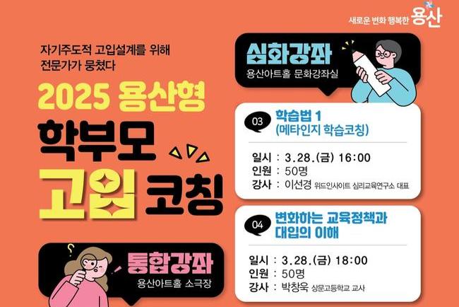 서울 용산구(구청장 박희영)가 이달 19일부터 중학생 자녀를 둔 학부모를 대상으로 `2025 용산형 학부모 고입코칭`을 운영한다.