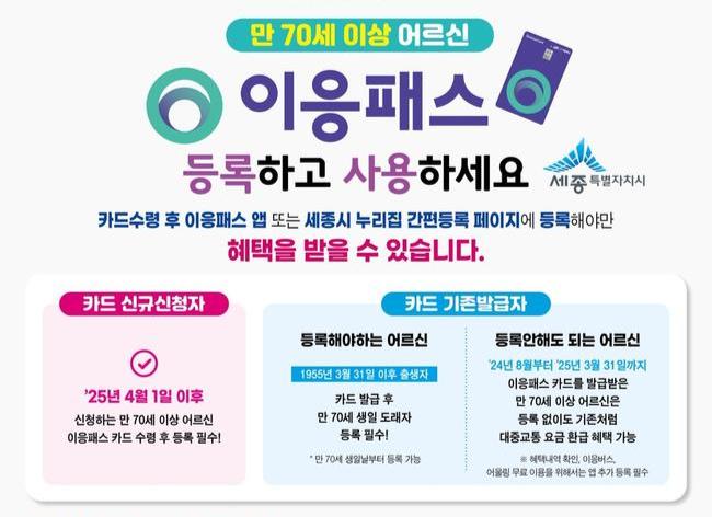 세종특별자치시(시장 최민호)가 오는 4월 1일부터 이응패스 카드를 신규 발급받는 만 70세 이상 어르신은 반드시 이응패스 앱에 카드등록을 해야 혜택을 받을 수 있다고 26일 밝혔다.