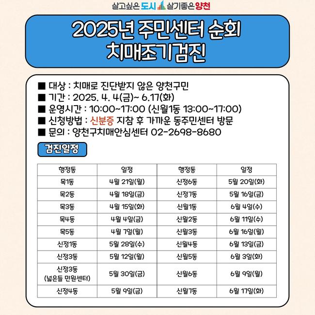 이번 순회 검진은 4일 목4동 주민센터를 시작으로 6월까지 동별 일정에 따라 이뤄진다. 검진 대상은 치매 또는 경도인지장애로 진단받지 않은 구민으로, 신분증 지참 후 주소지 동에 관계없이 가까운 동 검진 일정에 맞춰 방문하면 된다.