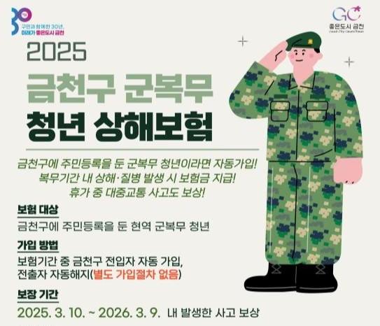 금천구(구청장 유성훈)는 군복무 중 상해 등 피해를 입은 청년들을 위해 `군복무 청년 상해보험`을 지원한다고 밝혔다.
