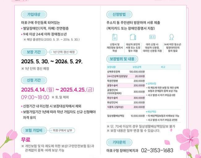 지원 대상은 보험 신청일 기준 마포구에 주민등록이 해 있는 발달장애인 전연령층 및 장애청소년 9∼24세(출생일 기준 2005.5.31.∼2016.5.30.)로 소득 기준 없이 누구나 신청할 수 있다.