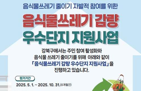 서울 강북구(구청장 이순희)는 음식물쓰레기 감량을 위해 오는 5월부터 `음식물쓰레기 감량 우수 공동주택 지원사업`을 본격 추진한다고 밝혔다.