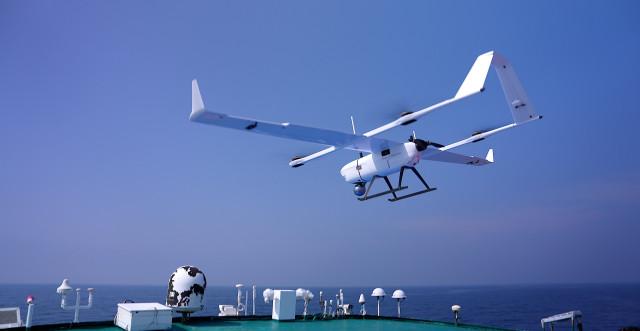 동원산업이 세계 최초로 개발한 어군 탐지 전용 드론이 참치 어군을 찾기 위해 비행하고 있다