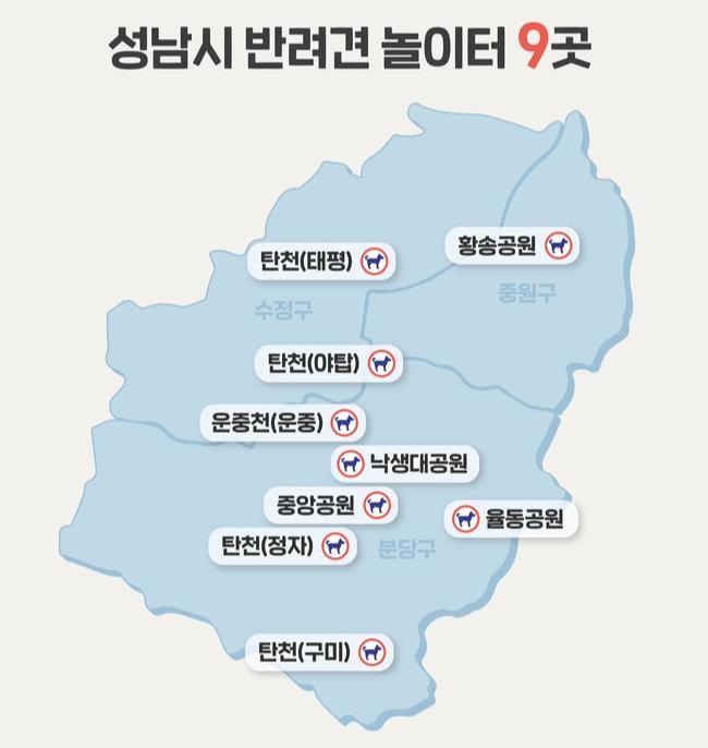 기존에 운영 중인 반려견 놀이터는 ▲황송공원 ▲중앙공원 ▲율동공원 ▲탄천 태평 수진쉼터 인근 ▲탄천 야탑 사송교 인근 ▲탄천 정자 궁내교 인근 ▲탄천 구미 물놀이장 인근 ▲삼평동 운중천에 있다.