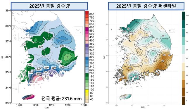 2025년 봄철 전국 강수량 및 퍼센타일 분포도