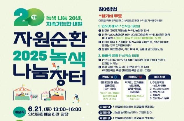 인천광역시(시장 유정복)는 탄소중립 실천과 나눔 문화 확산을 위해 인천시가 주최하고 인천YWCA가 주관하는 `2025 자원순환 녹색 나눔장터`(이하 나눔장터)를 오는 6월 21일 인천종합문화예술회관 광장에서 개최한다고 밝혔다.