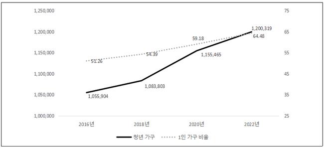 2022년 기준 ‘청년 가구(가구주가 만 19~39세인 가구)’는 총 120만 가구로, 서울 전체 가구의 29.3%를 차지하며 2016년 대비 13.7% 증가했다.