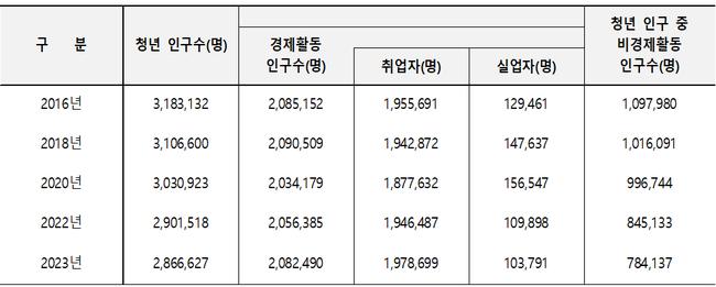 2016년 청년 경제활동인구는 2,085,152명, 취업자는 1,955,691명이었으나, 팬데믹 시기인 2020년에는 각각 2,034,179명과 1,877,632명으로 감소했다. 이후 2022년에는 2,056,385명과 1,946,487명으로, 2023년에는 2,082,490명과 1,978,699명으로 다시 증가하며 회복세를 보였다.