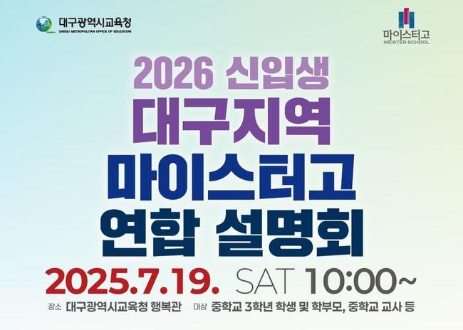 대구시교육청(교육감 강은희)은 7월 19일(토) 오전 10시에 행복관에서 2026학년도 신입생 모집을 위한 `마이스터고 연합 설명회`를 개최한다고 밝혔다.