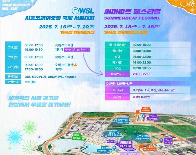 대회와 연계해 시흥시가 시민들이 즐길 수 있게 마련한 다양한 문화행사와 체험 프로그램도 눈길을 끈다. 18일부터 19일까지 이틀간 거북섬 웨이브파크 특설광장에서는 디제잉 축제인 `2025 시흥 써머비트 페스티벌`이 열려 박명수, 소다 등이 선보이는 디제이(DJ) 공연, 버스킹 등 다채로운 공연이 밤마다 이어진다.