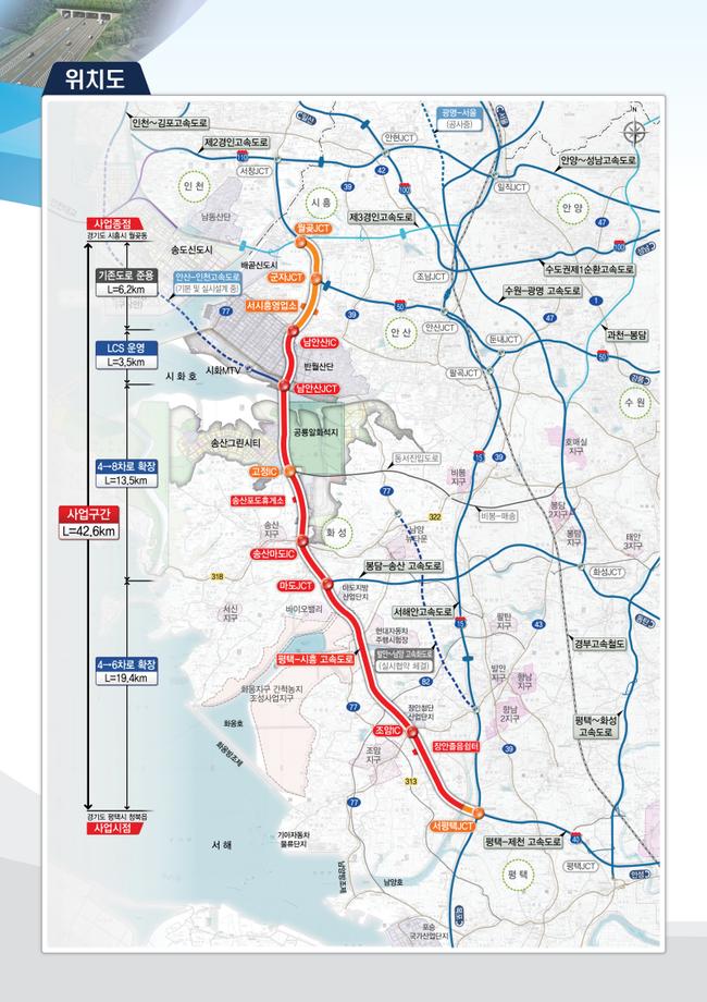 이번 확장 사업은 평택-시흥 고속도로(총연장 42.6km, 서평택JCT~월곶JCT) 중 서평택JCT부터 남안산IC까지 36.4km 구간을 현재 왕복 4차로에서 왕복 6~8차로로 넓히는 것이 핵심이다.
