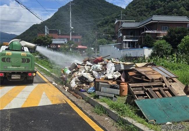 방역팀은 인력이 접근하기 어려운 산사태 지역까지 방역특장차를 동원해 소독 작업을 했다. 또 방역약품을 활용해 감염 매개체 서식처를 집중 방역소독했다.