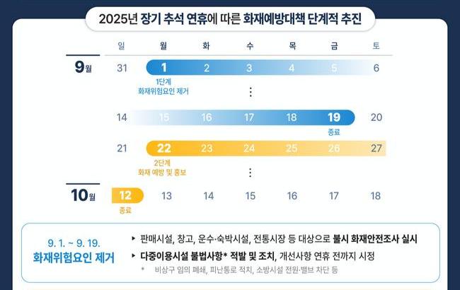 소방청은 이번 대책을 두 단계로 나눠 추진한다. 오는 9월 19일까지는 ‘화재위험요인 제거 기간’으로 정해 판매시설, 창고, 운수·숙박시설, 전통시장 등을 대상으로 불시 화재안전조사를 벌인다. 이 과정에서 비상구 폐쇄, 피난통로 적치, 소방시설 전원·밸브 차단 등 위법 행위에 대해 엄정 조치하고, 연휴 전까지 반드시 개선하도록 지도할 계획이다.