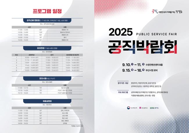 올해 공직 채용정보를 총망라한 ‘2025 공직박람회’가 수원과 부산에서 잇달아 열린다. 인사혁신처(처장 최동석)는 10일 수원컨벤션센터에서 개막해 11일까지 이어지며, 이어 15~16일에는 부산시청에서 개최된다고 밝혔다.