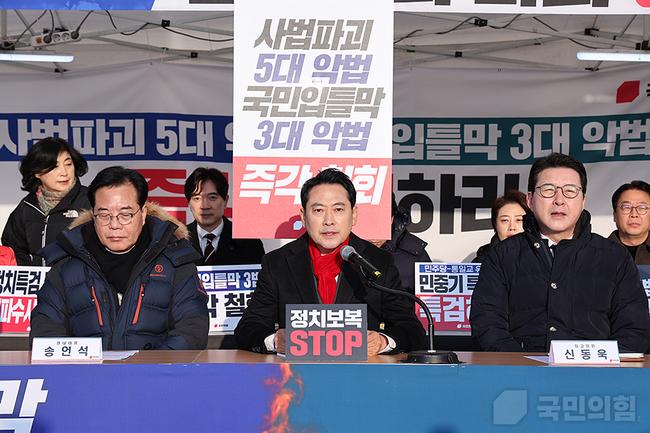 장동혁 “대통령 말이 불안…권력 남용이 사회 질서 흔든다” - 국회 앞 ‘8대 악법 저지’ 천막농성서 최고위 개최 - 이재명 대통령 발언 잇단 비판…사법부·언론 개입 주장 - 통일교 특검 촉구하며 야권 공조 강조