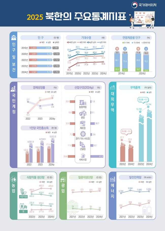 통계청은 북한이 인구 구조와 일부 산업 생산에서는 비교적 안정적인 모습을 보였지만, 소득과 산업 경쟁력, 무역 규모에서는 남한과의 격차가 구조적으로 지속되고 있다고 분석했다.