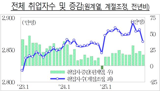 업종별로는 도소매업(1.1만→4.4만명), 운수·창고업(4.1만→7.2만명), 예술·스포츠·여가업(6.1만→5.5만명) 등을 중심으로 서비스업 고용 증가가 이어졌다. 다만 전문·과학·기술서비스업은 기저효과 영향으로 0.2만명 증가에서 5.6만명 감소로 전환했다. 보건·복지업은 연말 직접일자리 사업 종료 영향으로 28.1만명에서 22.0만명으로 증가폭이 줄었다.