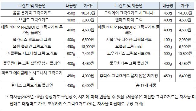그릭요거트 단백질 최대 2.2배 차이…가격은 4배 격차 - 열량·지방도 최대 4배 차이…당류는 제품 간 10배까지 - “섭취 목적 따라 영양·가격 꼼꼼히 비교해야”