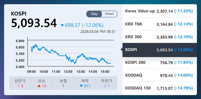 이 날 코스피 지수는 5,093.54로 전 거래일 대비 698.37포인트(−12.06%) 하락했다. 거래량은 약 16억2천만주, 거래대금은 약 62조6천억 원에 달했다. 시가총액은 약 4,194조9천억 원 수준으로 줄어들었다.