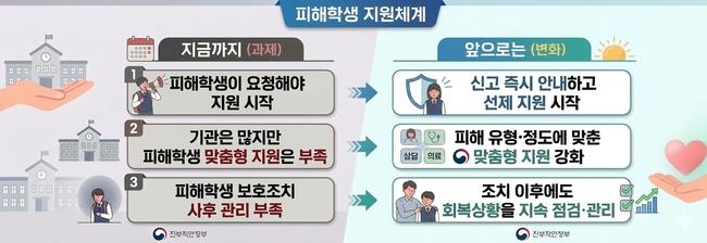 피해학생 지원 체계도 전면적으로 재정비한다. 기존에는 피해학생과 학부모가 직접 지원 서비스를 찾아야 했지만 앞으로는 학교폭력 신고나 접수가 이루어지면 학교장이 지원 가능한 서비스와 보호조치, 절차 등을 신속하게 안내하도록 제도를 개선한다.