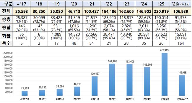 정부는 전기차 수요 확대 요인으로 제조사들의 신차 출시 확대와 가격 할인 경쟁, 내연기관 차량 전환 지원금 등 보조금 정책, 그리고 최근 중동 정세에 따른 고유가 흐름을 꼽았다. 실제로 4월 17일 기준 전기차 보급대수는 10만6939대로, 이 중 전기승용차가 9만1373대로 대부분을 차지했고 전기화물 1만5091대, 전기승합 311대 순으로 나타났다.