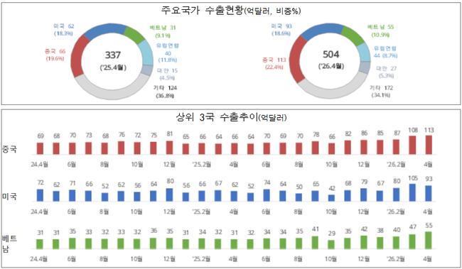 4월 수출 504억달러 ‘역대 최대’…반도체 호조에 무역흑자 104억달러 - 전년 대비 수출 49% 급증…반도체 비중 36%로 확대 - 중국·미국·베트남 수출 동반 증가…수입도 17% 늘어