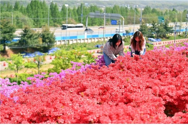 약 1만 1천㎡ 부지를 가득 채운 영산홍은 잎보다 꽃이 먼저 피어나는 특성 덕에 빈틈없는 붉은 빛을 선사한다. 꽃길 어디서든 카메라만 대면 `인생 사진`을 건질 수 있다는 입소문이 퍼지면서 인스타그램과 블로그 등 사회관계망서비스(SNS)에서도 반응이 뜨겁다.