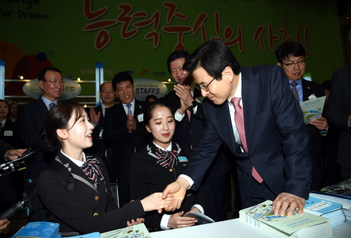 황교안 국무총리가 23일 경기 고양시 일산 킨텍스에서 열린 대한민국 고졸인재 잡콘서트에서 상담 중인 학생들과 만나 격려하고 있다.
